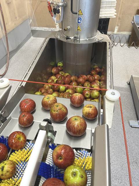 Nach drei Reinigungsprozessen, in denen Sie die Möglichkeit haben angefaultes Obst zu entfernen, kommt das Obst über eine Rätzmühle in unsere Packpresse. Durch dieses Pressverfahren wird der Trübstoffanteil im Saft verringert. Dadurch kann der Saft sofort nach dem Pressen pasteurisiert, dann in Bags abgefüllt oder als Rohsaft mitgenommen werden.